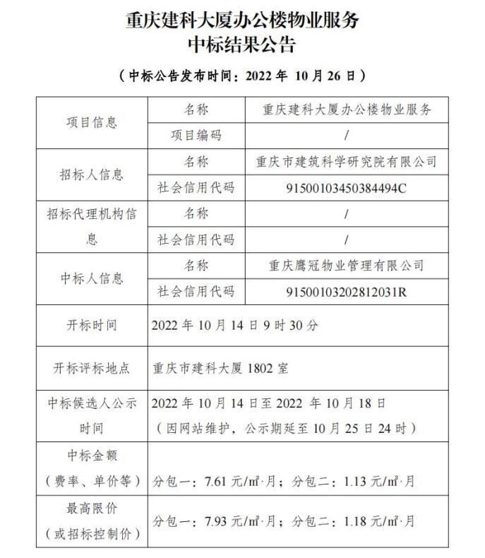 重慶建科大廈辦公樓物業(yè)服務中標結果公告