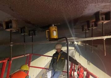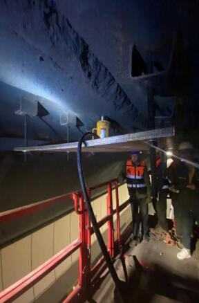 該項(xiàng)檢測(cè)工作時(shí)間緊、任務(wù)重,檢測(cè)操作難度較大。為了更好地完成檢測(cè)工作,公司立即組織相關(guān)人員成立專項(xiàng)技術(shù)小組并召開(kāi)技術(shù)論證會(huì),隨后及時(shí)安排人員開(kāi)展現(xiàn)場(chǎng)檢測(cè)工作,由于該隧道交通通行壓力較大,檢測(cè)工作選擇在晚上10點(diǎn)后進(jìn)行,并協(xié)調(diào)重慶市渝中區(qū)交警支隊(duì)進(jìn)行交通導(dǎo)行,在移動(dòng)吊車、自卸式起重車等多種特種作業(yè)設(shè)備的支持下,爭(zhēng)分奪秒,于凌晨3點(diǎn)順利完成了風(fēng)機(jī)吊架承載力檢測(cè)工作。