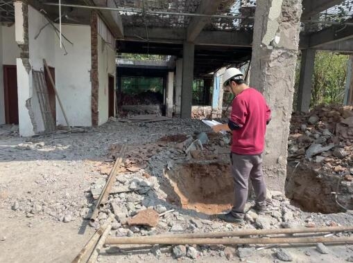 4月初,業(yè)主單位在拆除朝華書院項目裝修結(jié)構(gòu)并開挖基礎(chǔ)時,發(fā)現(xiàn)實際情況與前期鑒定報告中基礎(chǔ)及結(jié)構(gòu)部分不符,施工圖設(shè)計單位無法進行后續(xù)設(shè)計及指導(dǎo)現(xiàn)場施工,導(dǎo)致項目無法推進,亟需具有權(quán)威性及專業(yè)性的單位對房屋結(jié)構(gòu)進行全面檢測,并繪制現(xiàn)場實際結(jié)構(gòu)圖。市建科公司對此類無圖紙或圖紙信息不符的既有房屋檢測鑒定有豐富經(jīng)驗,能夠迅速組織專家組對房屋進行診治,做到對癥施治,切實消除安全隱患。接到委托后,公司專家組立即趕赴現(xiàn)場開展檢測工作,頭頂驕陽汗如雨,不懼“烤”驗趕工,經(jīng)過十余天的艱苦奮戰(zhàn)完成現(xiàn)場檢測工作,轉(zhuǎn)入數(shù)據(jù)統(tǒng)計及繪制圖紙的室內(nèi)工作中。