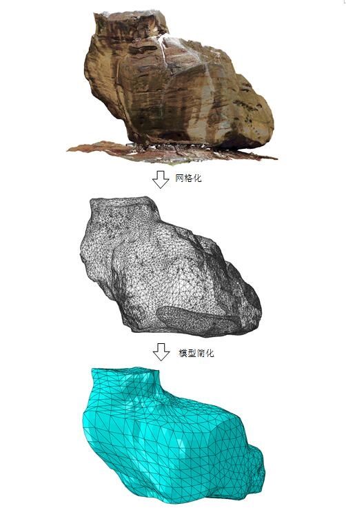 在對紗帽石穩(wěn)定性進行評估過程中,市建科院技術團隊與重慶交通大學相關專家經過多次溝通,確定了定性分析+數值模擬的評估方案。評估中定性分析了紗帽石的當前所處環(huán)境、形態(tài)特征、結構特征、破壞模式等,作出紗帽石穩(wěn)定性定性分析初步評價。另外,評估采用三維激光掃描儀,對紗帽石進行3D掃描,復原出紗帽石的三維模型,再將其導入有限元計算軟件中,建立含有紗帽石的邊坡模型,對其在多種荷載工況下的穩(wěn)定性進行了有限元計算,最終提出了合理的評估和建議。