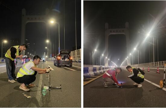 鵝公巖長江大橋是重慶主城區(qū)橫跨長江連接九龍坡區(qū)和南岸區(qū)的重要特大橋梁,是快速抵達成渝高速和渝黔高速的主要通道,大橋為雙向八車道,于2000年12月建成通車。近年來,隨著車流量急速增長及重車通行,橋面瀝青鋪裝層產(chǎn)生較多病害,可能影響使用壽命。為全面掌握橋面鋪裝層病害狀況,檢測中心選派豐富經(jīng)驗的檢測人員提前收集項目資料,協(xié)商交通組織方案并編制檢測方案,保證任務順利開展。全體檢測人員高度重視夜間工作的安全問題,布設大量交通導行標牌、施工限速標志等交通設施,全員穿反光背心、佩戴安全警示燈進行病害分布、平整度、摩擦系數(shù)、構造深度等指標的檢測,確保數(shù)據(jù)的真實性和準確性。最終檢測數(shù)據(jù)和狀況評估以報告編制工作會的形式發(fā)布,為鋪裝層病害專項整治專項設計提供了技術依據(jù),為后續(xù)的橋面鋪裝層病害整治方案制定提供了科學支撐。