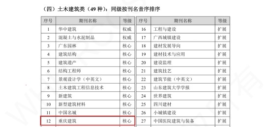 《報告》顯示,首次發(fā)布的評價結果中,“土木建筑類”應用型期刊合計49本,其中2本“權威”,10本“核心”?!吨貞c建筑》入選“核心”期刊,按音序排第12位。