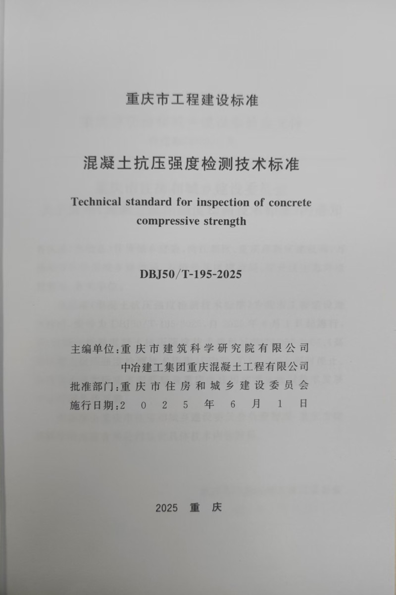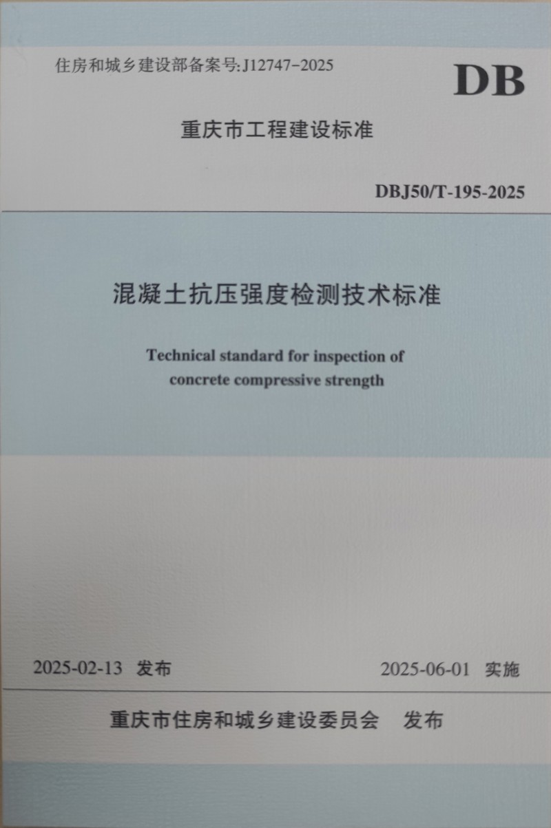 近日,由重慶設(shè)計(jì)集團(tuán)所屬子企業(yè)重慶市建筑科學(xué)研究院有限公司(以下簡(jiǎn)稱“市建科院”)聯(lián)合中冶建工集團(tuán)重慶混凝土工程有限公司主編的重慶市《混凝土抗壓強(qiáng)度檢測(cè)技術(shù)標(biāo)準(zhǔn)》(DBJ50/T-195-2025)(以下簡(jiǎn)稱《標(biāo)準(zhǔn)》)正式發(fā)布,經(jīng)重慶市住房和城鄉(xiāng)建設(shè)委員會(huì)批準(zhǔn),將于2025年6月1日正式實(shí)施。