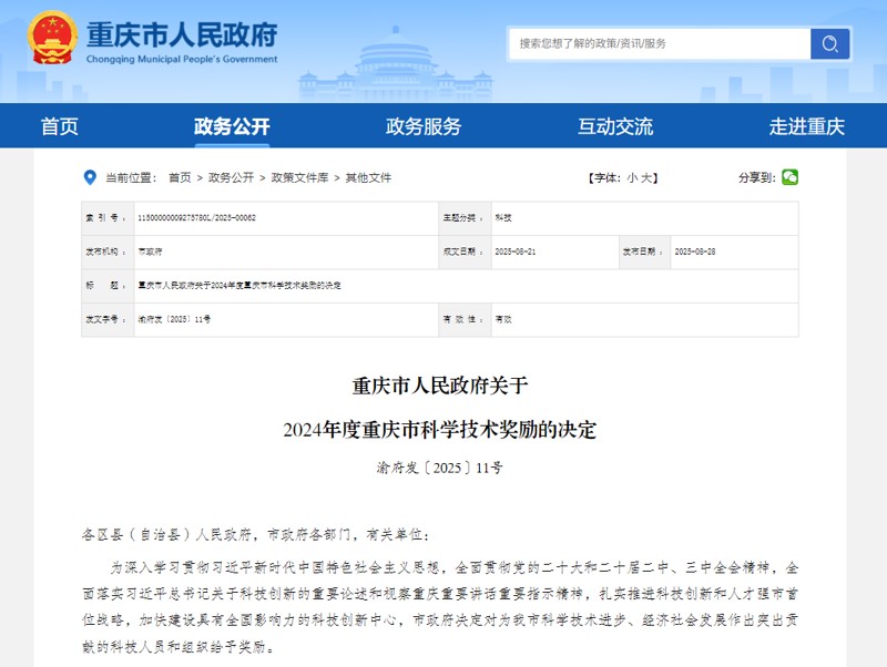 重慶市人民政府網(wǎng)站發(fā)布2024年度重慶市科學(xué)技術(shù)獎(jiǎng)勵(lì)的獎(jiǎng)勵(lì)決定和獲獎(jiǎng)名單