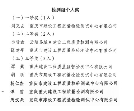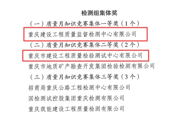市建科院所屬重慶建設工程質(zhì)量監(jiān)督檢測中心有限公司、重慶市建設工程質(zhì)量檢驗測試中心有限公司在檢測組比賽中表現(xiàn)突出,分別摘得檢測組集體獎一等獎和檢測組集體獎二等獎。
