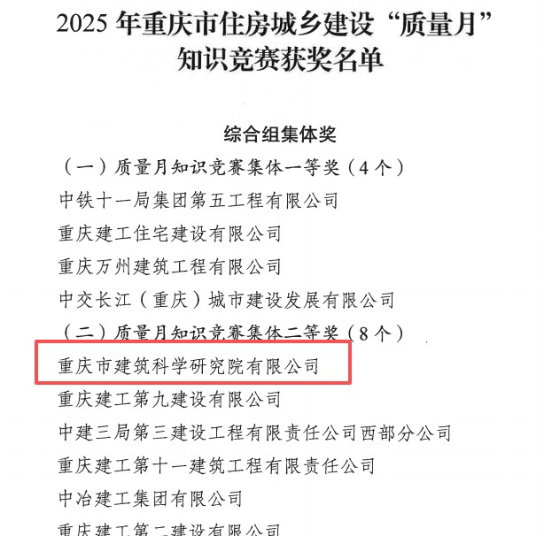 近日,重慶設計集團所屬子企業(yè)重慶市建筑科學研究院有限公司(以下簡稱“市建科院”)在參加重慶市住房和城鄉(xiāng)建設工程質(zhì)量安全總站、重慶市建設工程質(zhì)量協(xié)會組織開展的2025年重慶市住房城鄉(xiāng)建設“質(zhì)量月”知識競賽中,榮膺3項集體獎、8項個人獎。