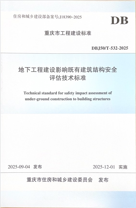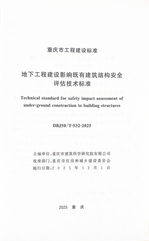 近日,由重慶設(shè)計集團(tuán)所屬子企業(yè)重慶市建筑科學(xué)研究院有限公司(以下簡稱"市建科院")主編的《地下工程建設(shè)影響既有建筑結(jié)構(gòu)安全評估技術(shù)標(biāo)準(zhǔn)》獲重慶市住房和城鄉(xiāng)建設(shè)委員會批準(zhǔn)為重慶市工程建設(shè)地方標(biāo)準(zhǔn),編號為(DBJ50/T-532-2025),將于2025年12月1日起實施。