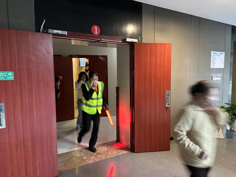 理論培訓(xùn)現(xiàn)場,一陣急促的警報(bào)聲突然響起,火災(zāi)緊急疏散演練正式開始。模擬火災(zāi)場景設(shè)定為辦公區(qū)因不明原因起火,引燃周邊可燃物,致使火勢迅速擴(kuò)大,并向樓層四周及建筑上層蔓延?,F(xiàn)場工作人員發(fā)現(xiàn)火災(zāi)后,立即按下火災(zāi)報(bào)警裝置并按報(bào)告程序,建科大廈火災(zāi)警報(bào)、消防卷簾門等消防設(shè)施瞬間聯(lián)動(dòng)。應(yīng)急領(lǐng)導(dǎo)小組收到報(bào)告后立即啟動(dòng)消防應(yīng)急預(yù)案,各應(yīng)急小組各司其職,火速奔赴現(xiàn)場展開搶險(xiǎn)。在樓層安全員的精準(zhǔn)指揮引導(dǎo)下,各樓層員工快速反應(yīng),沿著正確的疏散路線有序撤離至安全集合點(diǎn)。