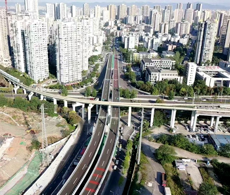 新九中路工程起點(diǎn)接二縱線華巖3號立交東側(cè),途經(jīng)九中隧道、新郭伏路、陳庹路,終點(diǎn)接大渡口區(qū)錦霞街,項(xiàng)目連通快速路二縱線、內(nèi)環(huán)快速路、西城大道等快速通道,加強(qiáng)華巖、二郎、九宮廟等區(qū)域的交通聯(lián)系,強(qiáng)化大渡口區(qū)與九龍坡區(qū)之間的區(qū)域聯(lián)動,有效緩解周邊區(qū)域交通壓力、提高出行效率。