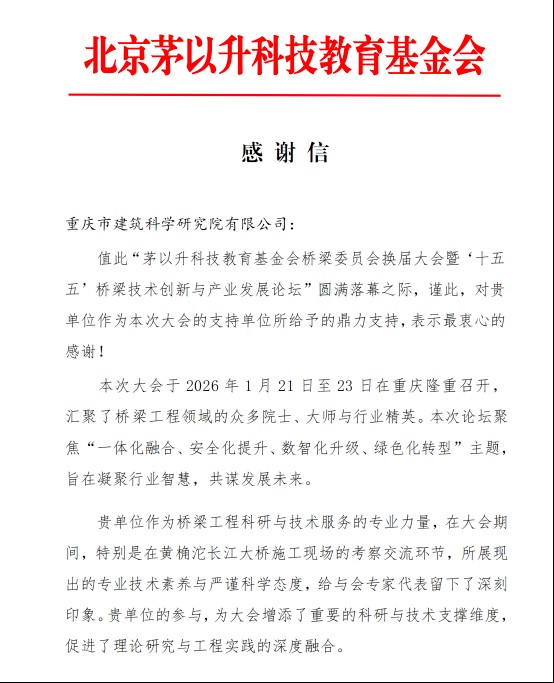 基金會(huì)在感謝信中表示,市建科院的監(jiān)理工作和專業(yè)展示,為本次論壇的成功舉辦提供了重要支撐,體現(xiàn)了新時(shí)代監(jiān)理單位在重大工程建設(shè)中的技術(shù)擔(dān)當(dāng)與行業(yè)價(jià)值。這份認(rèn)可,既是對(duì)市建科院團(tuán)隊(duì)專業(yè)能力的認(rèn)可,也是對(duì)重慶設(shè)計(jì)集團(tuán)在橋梁工程領(lǐng)域持續(xù)貢獻(xiàn)的肯定。